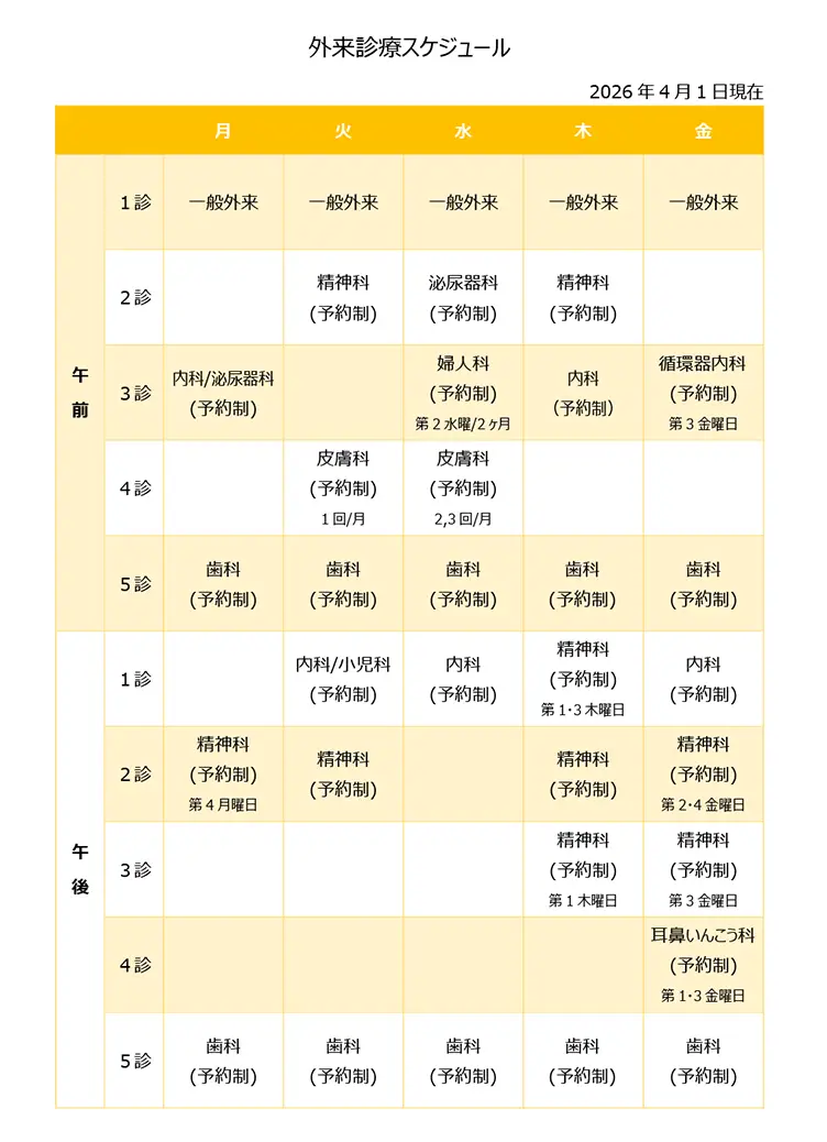 | 診療科目 | 内科、精神科、循環器内科、皮膚科、小児科、外科、泌尿器科、 整形外科、耳鼻いんこう科、婦人科、リハビリテーション科、歯科 |